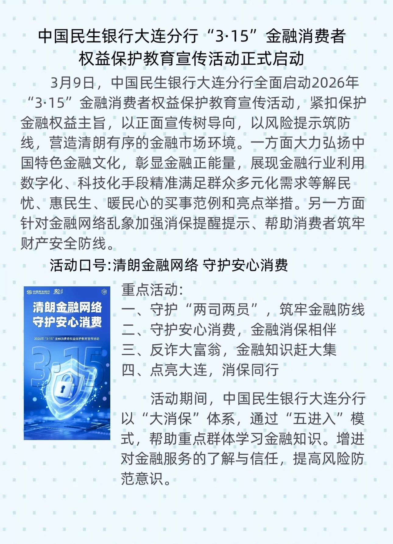 【3·15】中国民生银行大连分行“3·15”金融消费者权益保护教育宣传活动正式启动