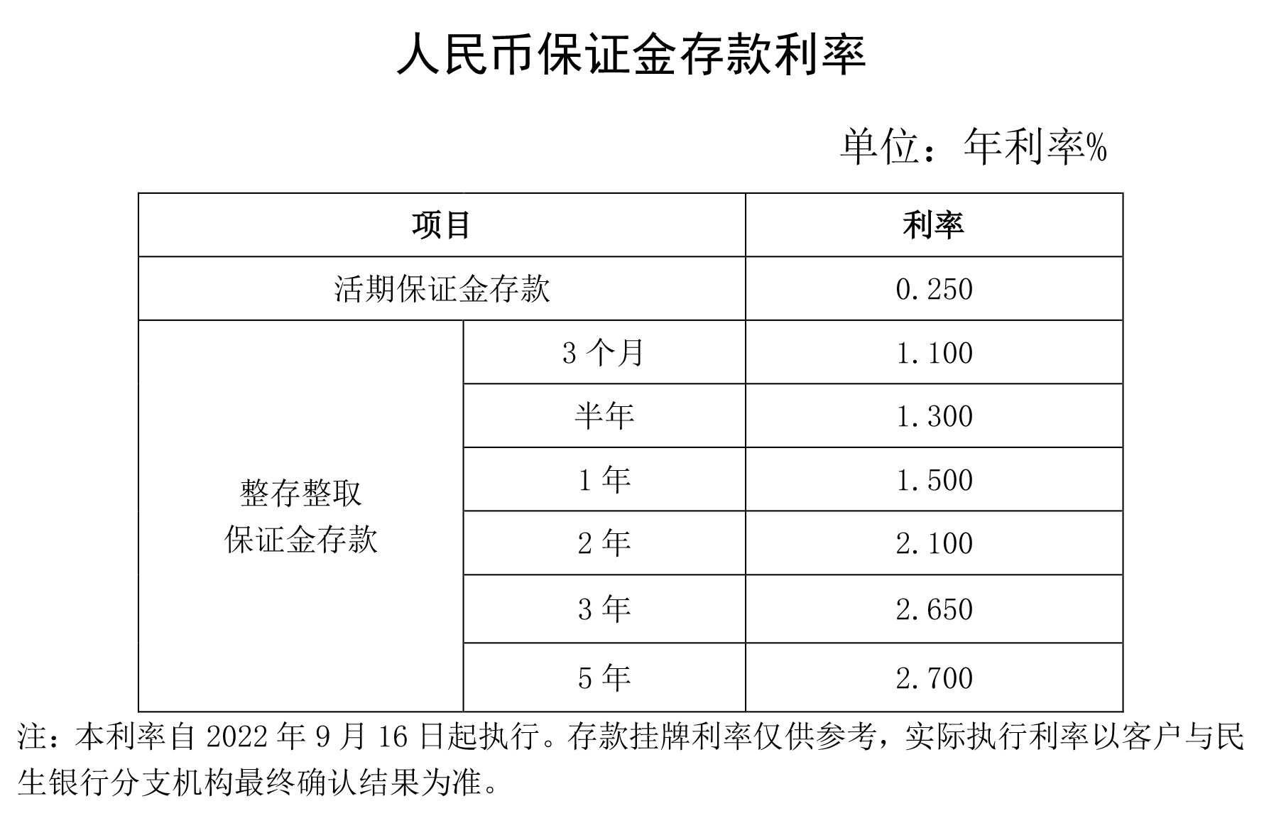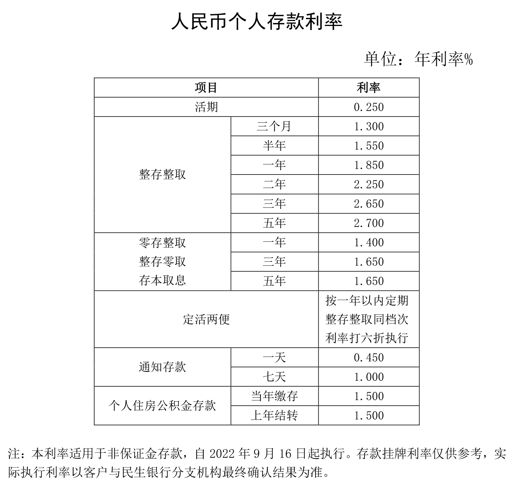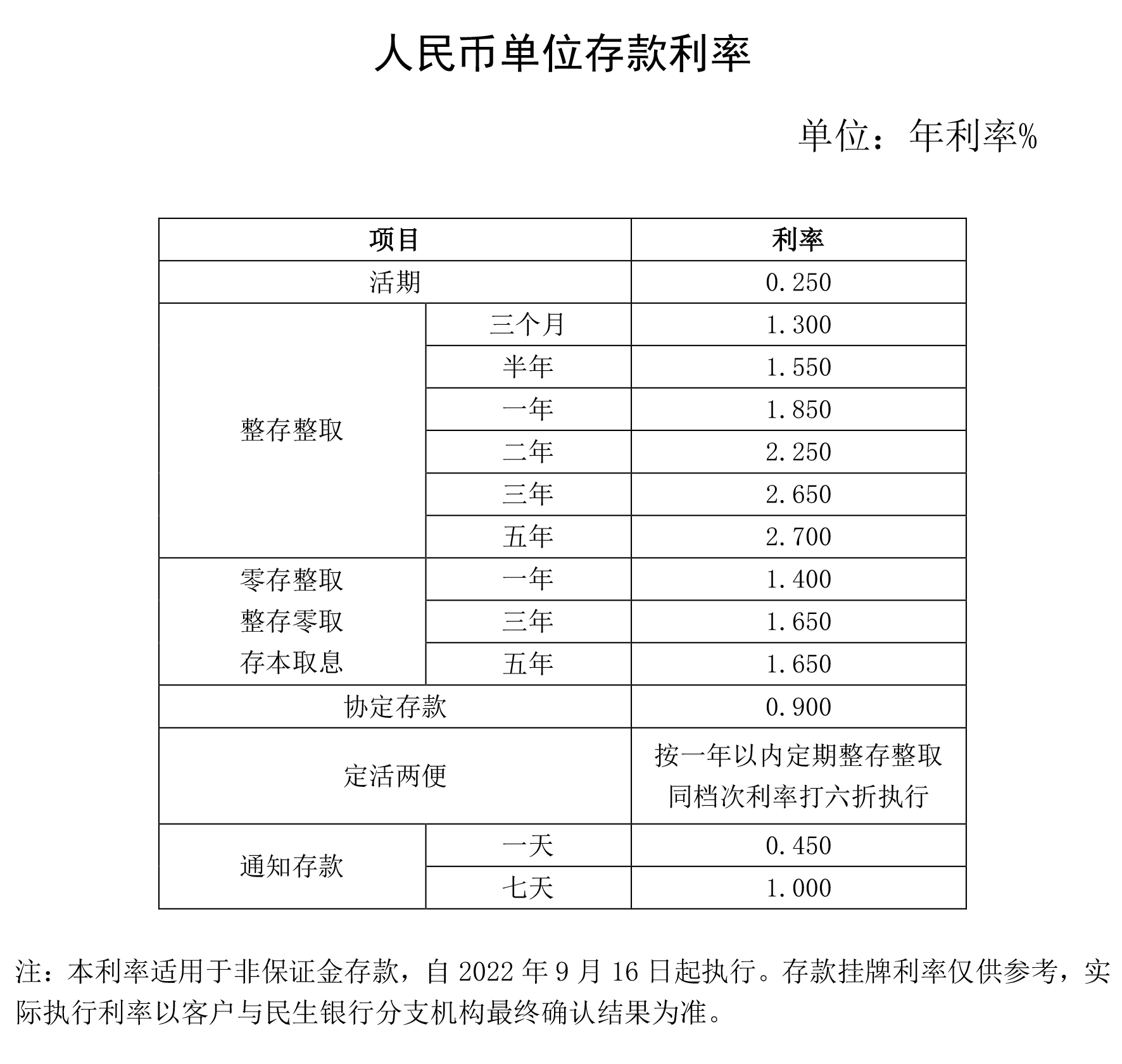 人民币存款利率调整(2022年9月16日起执行)