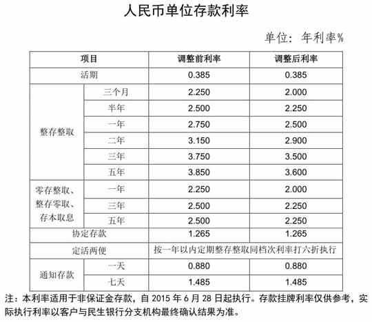 人民币存款利率调整(2015年6月28日起执行)