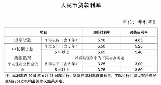 人民币贷款利率调整表(2015年6月28日起执行)