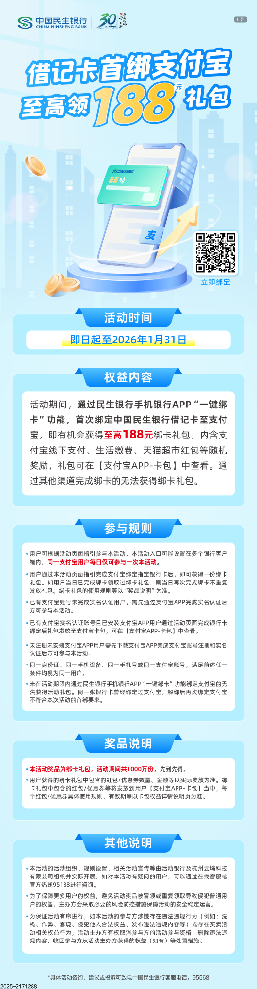 民生银行借记卡首绑支付宝 至高领188元礼包