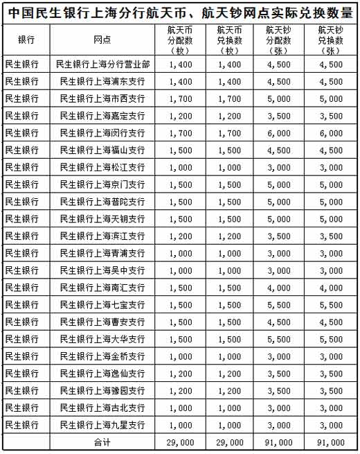 民生银行上海分行航天纪念币、纪念钞实际兑换数量公告
