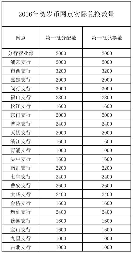 中国民生银行上海分行贺岁纪念币各网点实际兑换数量