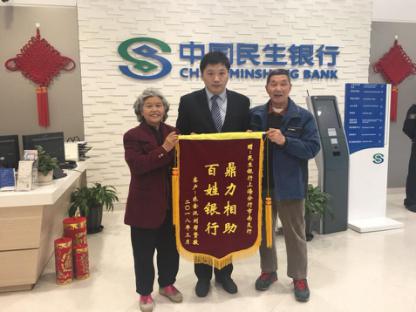 2018年1月,一对84岁高龄老夫妇神情焦虑的来到市南支行,厅堂人员主动迎接。经了解,其在民生银行成都建设路支行有笔动迁款,办理了一张银行卡和一笔3个月的定期存单,但该存单开户银行设置为凭证件支取,不可通存通兑处理,在与成都建设路支行取得联系,说明情况后,被告知拆迁办要求必须本人去成都当地领取银行卡和存单才能拿到动迁款。为此,支行多次与成都建设路支行和四川动拆迁部门进行沟通处理该笔业务,开动脑筋通过各种渠道途径,为这对老夫妇出谋划策。经过不懈努力,该老人终于成功支取了该笔动拆迁款。他们激动不已,特赠送锦旗表示感谢,对民生银行的服务和业务能力水平表示十分满意,并表示要做民生银行的忠实客户。